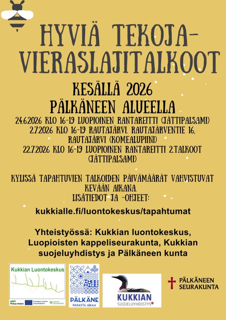 Ensimmäiset talkoot 24.6.2026 klo 16-19 Luopioisissa rantareitillä. Tarkoitus on kitkeä jättipalsamia muutamalta rantareitin varrella olevalta esiintymältä.